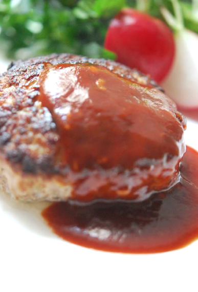 ①玉ねぎはみじん切り。フライパンに油(分量外)を熱し、塩を加え、玉ねぎを炒める。玉ねぎが透き通ってしんなりしたら、取り出し、冷ましておく。 ②合挽き肉に水塩を入れ、よく混ぜる。①の玉ねぎ、卵、香辛料を加え、よく混ぜる。4等分にし、空気を抜くように形を整える。 ③フライパンに油(分量外)を熱し、②を焼く。下の面に焼き色がついたら、裏返し、蓋をして中まで火を通す。竹串を刺して、透明な汁が出てくるようならOK。 ④器に盛り、お好みの野菜を添え、ケチャップとウスターソースを混ぜたソースをハンバーグにかける。 | |||